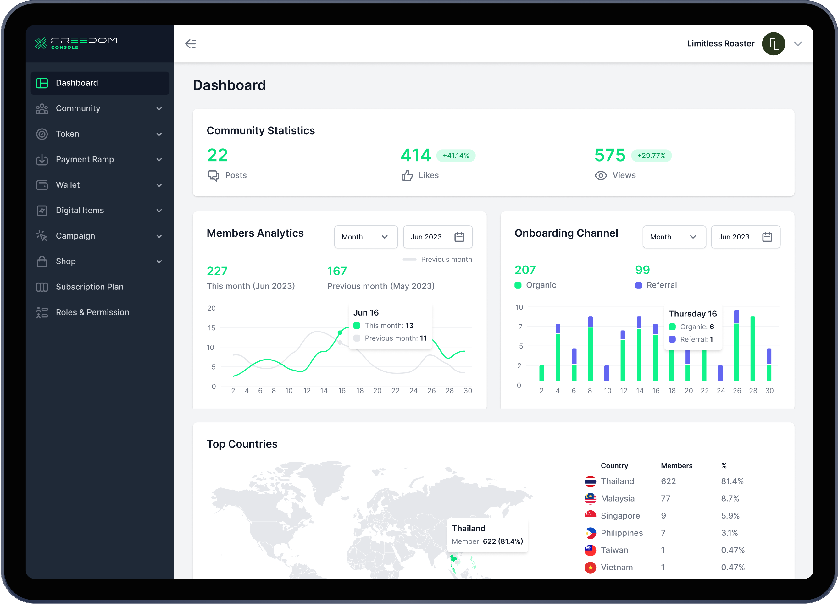 Track, manage, and analyze community activities via the Freedom Console - a simple yet powerful control panel for the Freedom World app. Scale campaigns in real-time with data-driven insights, anytime.